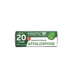Komposterbare affaldsposer 20 liter. Affaldsposer fra Maistic er komposterbare og indeholder ikke alm. plastik. Poserne bærer certificeringen OK Compost HOME og kan dermed nedbryde til vand, CO2 og biomasse – også hvis de skulle havne i naturen. Materiale (Læs mere)