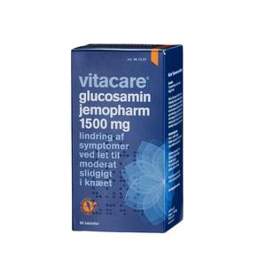 VitaCare Glucosamin JemoPharm 1500 mgOBS! Tabletterne er store, da de indeholder 1500 mg pr. stk. (mål: 9,5 x 21 mm.)VitaCare Glucosamin JemoPharm 1500 mg. med 90 tabletter, er et lægemiddel til lindring af symptomer ved let til moderat slidgigt i knæet. (Læs mere)